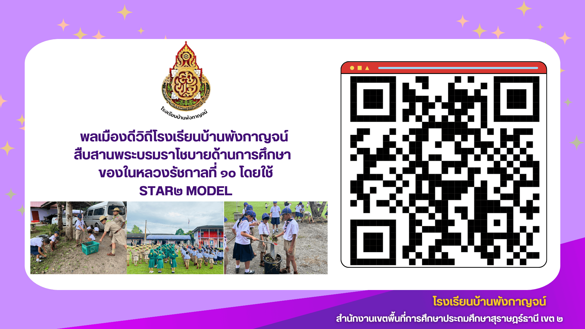 ชื่อผลงาน : เผยแพร่วิธีปฏิบัติที่เป็นเลิศ (Best Practice) เรื่อง เรื่อง พลเมืองดีวิถีโรงเรียนบ้านพังกาญจน์ สืบสานพระบรมราโชบายด้านการศึกษาของในหลวงรัชกาลที่ ๑๐ โดยใช้ STAR๒Model